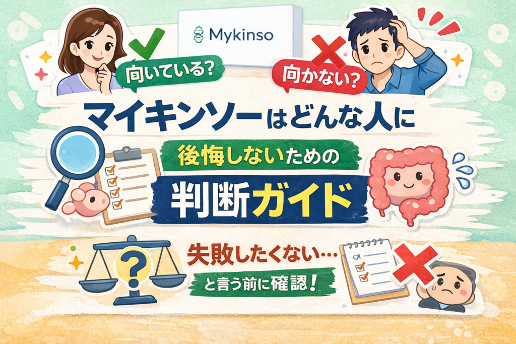 腸内フローラ検査に少し興味はあるものの、「自分に本当に必要なのか分からない」と感じていませんか? このページでは、腸内フローラ検査の中でもマイキンソーが向いている人・向かない人を、無理にすすめない前提で整理しています。 マイキンソーは「体...